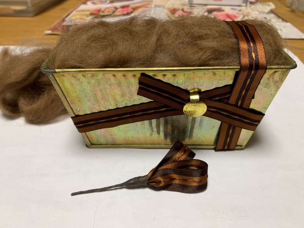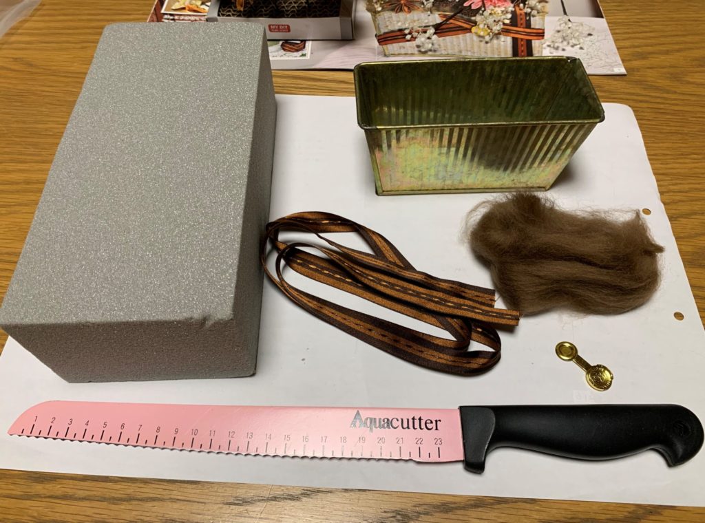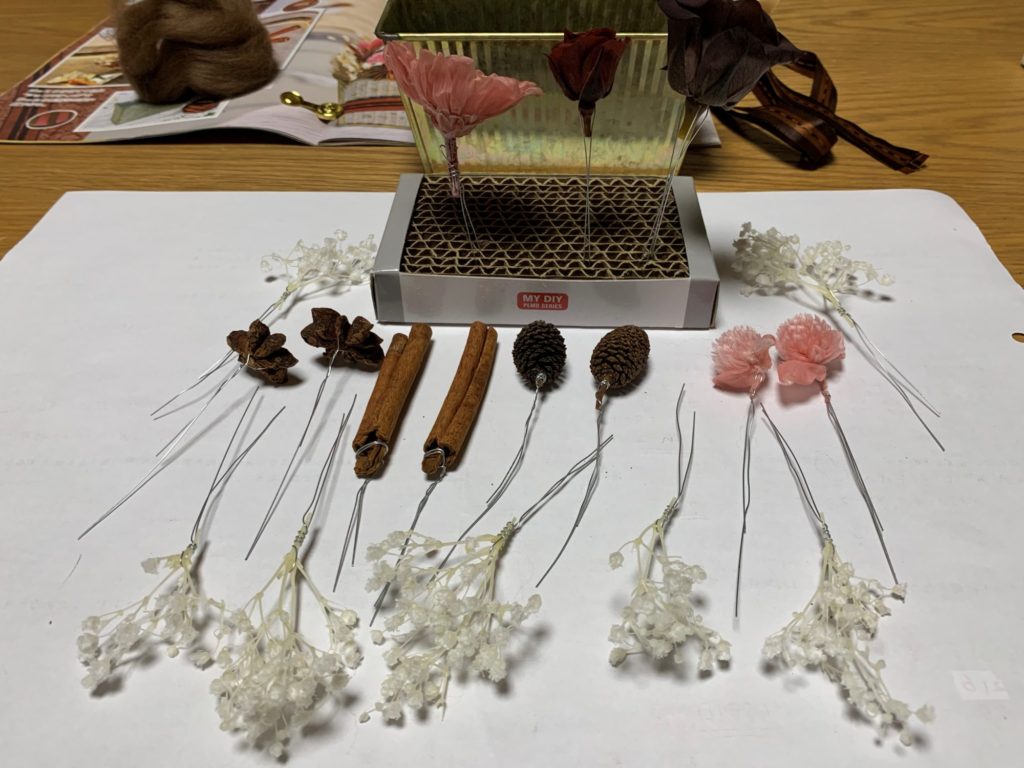 そして、土台作りです。フォームをカットして、ブリキの花器に入れ、コットンとリボンを作っていきます。