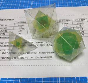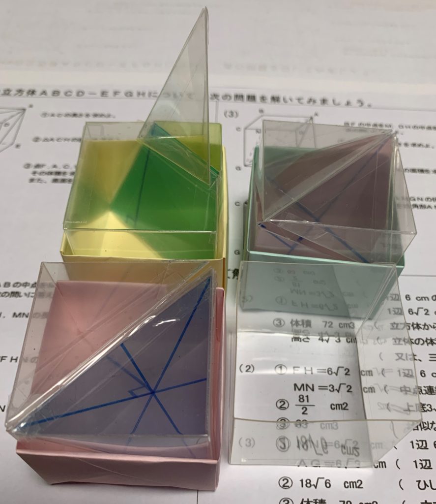 立方体の切断問題、正多面体、入試問題などの立体を手に取って見れるものにしております。